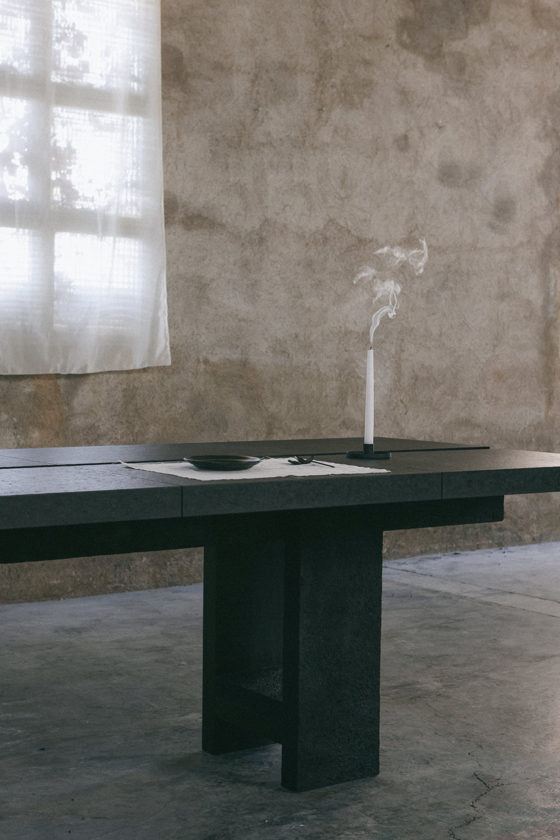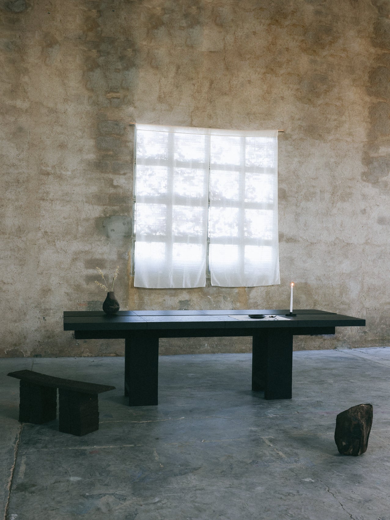 The essence of the table lies in the qualities of its composition. The table is split symmetrically between the two materials, forming a dialogue between the wood and the bark of the oak tree. The materials are, in a sense, twin oaks.
